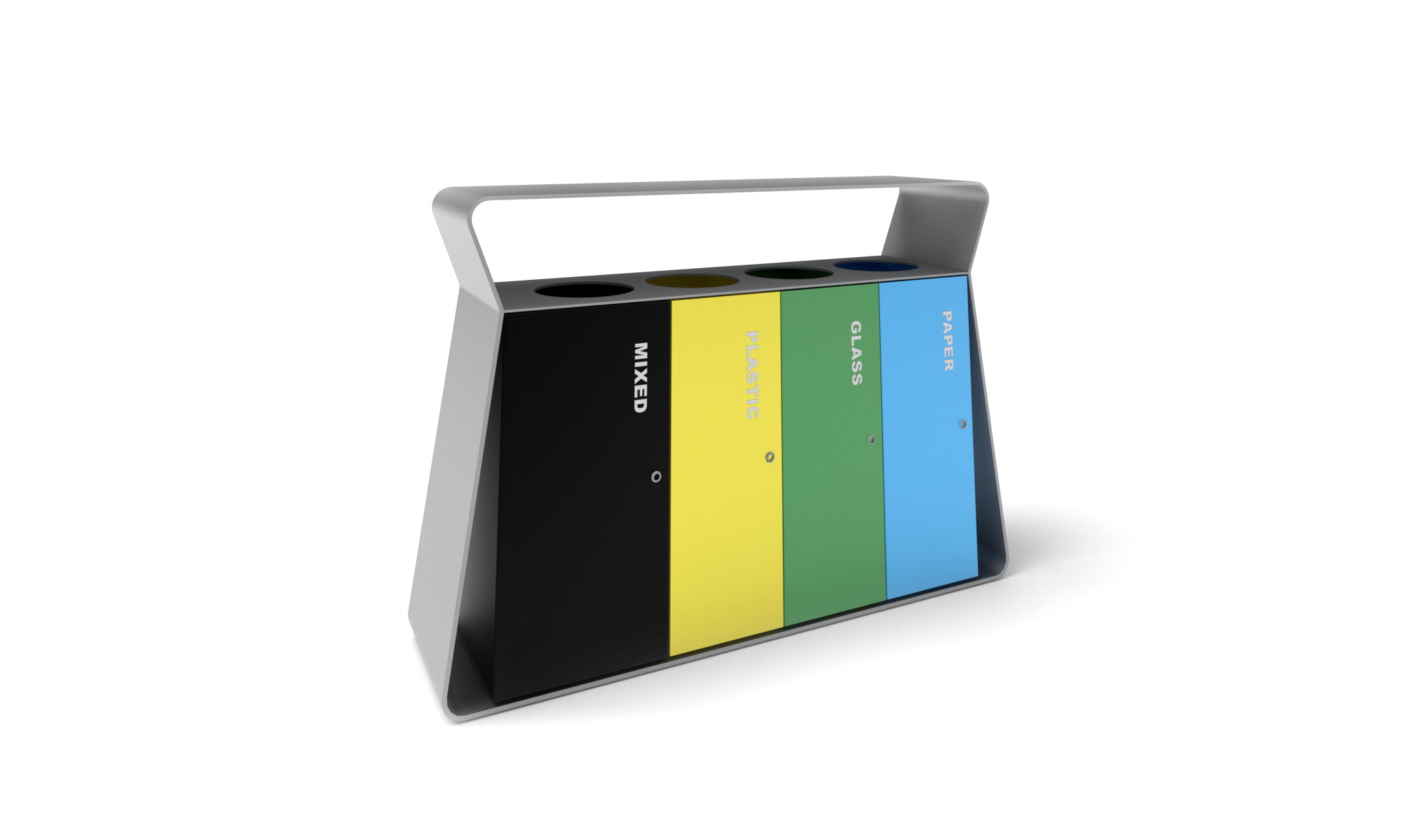 Odpadkový koš TAPER inspirovaný tvarem písmene T. Jednoduchá linie prochází celým výrobkem. Výrobek je určet pro tříděný odpad. Celková konstrukce zajišťuje dostatečnou stabilitu. Stříška koše chrání obsah před deštěm. Barvy košů i popisky usnadňují orientaci při třídění.